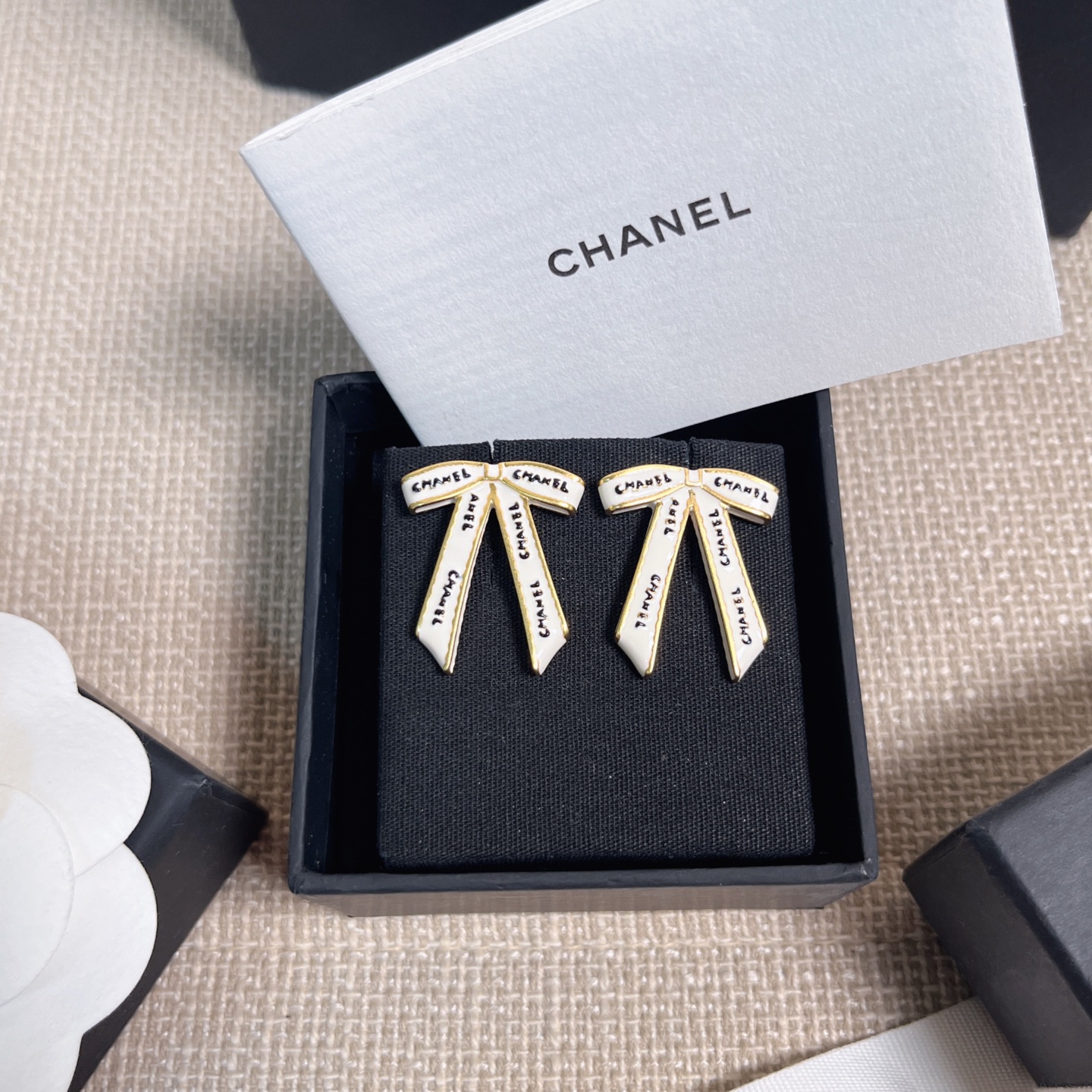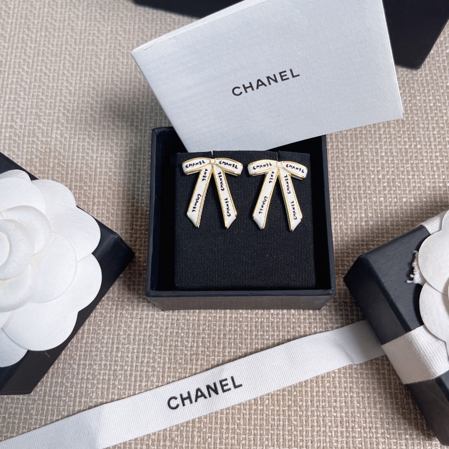 2025早秋新款 Chanel 黑字母白絲帶蝴蝶結耳環 精品 高仿