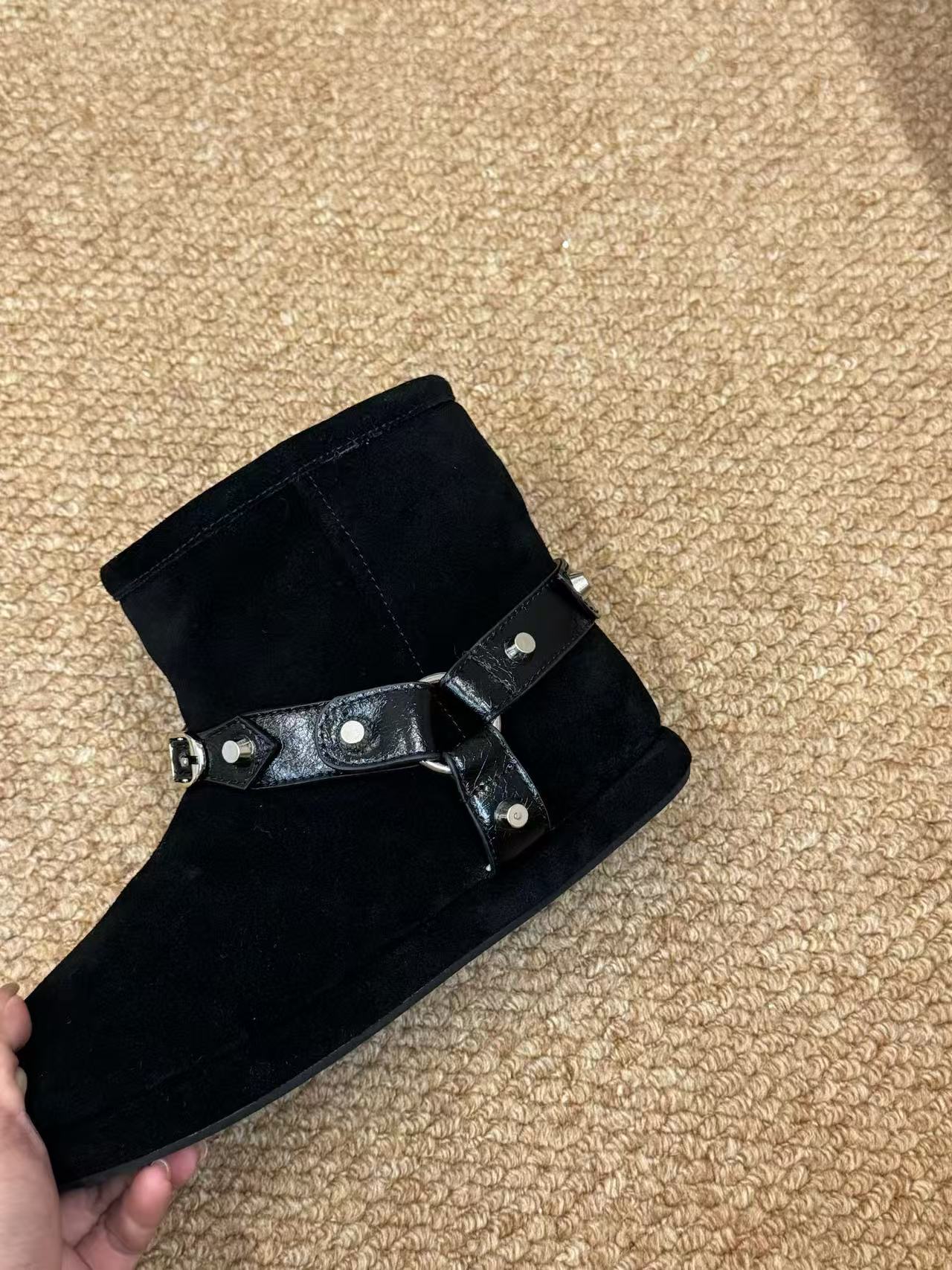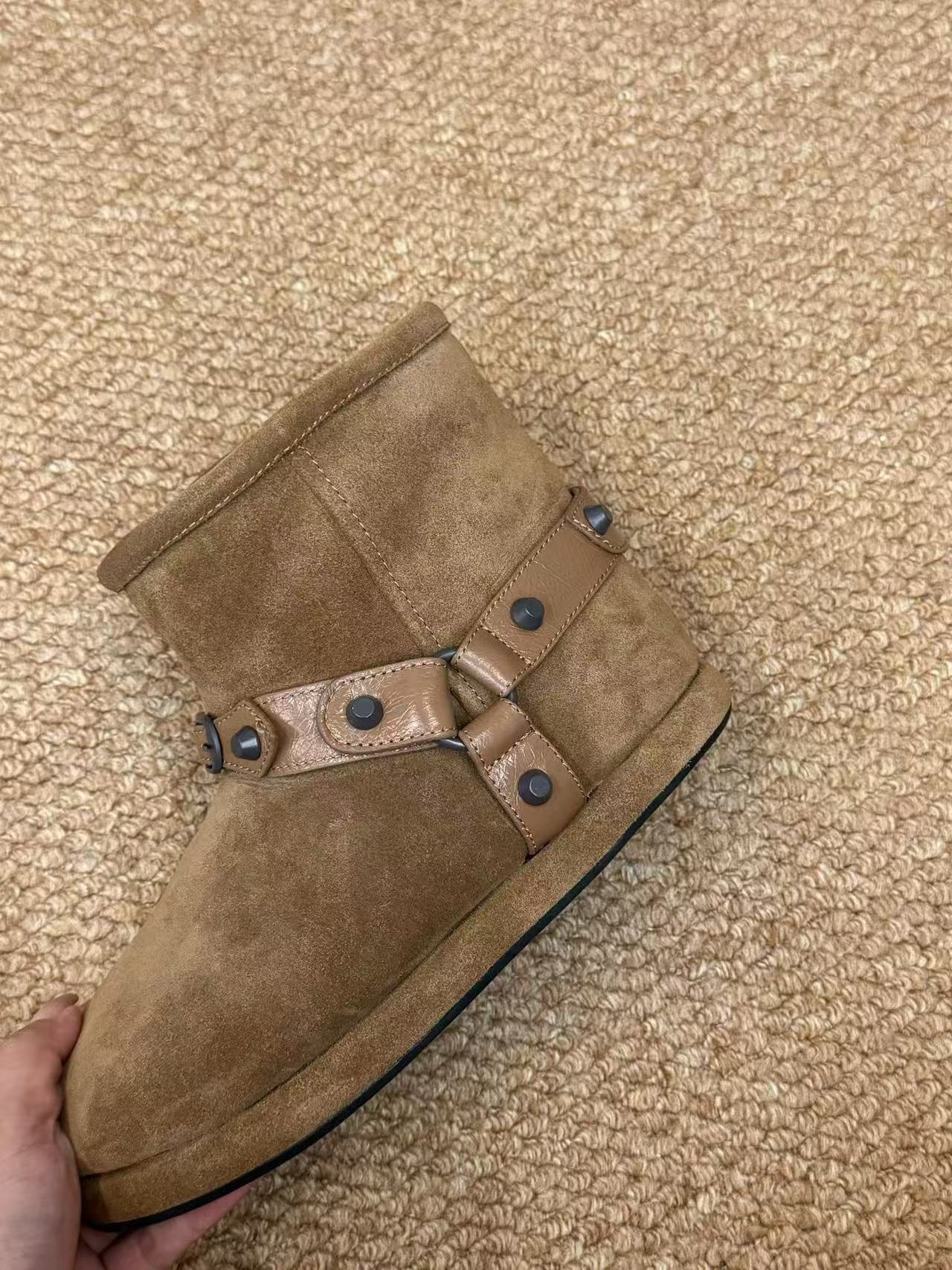 圓頭設計帶來可愛的圓潤感,厚底提升顯瘦與防滑實用性,而鉚釘的巧妙排列則是靈魂所在——每顆都經精細固定,閃耀冷冽金屬光澤,與翻毛皮的溫柔絨感形成強烈對比。這雙靴子的高仿品質使其在奢侈品市場中佔有一席之地。