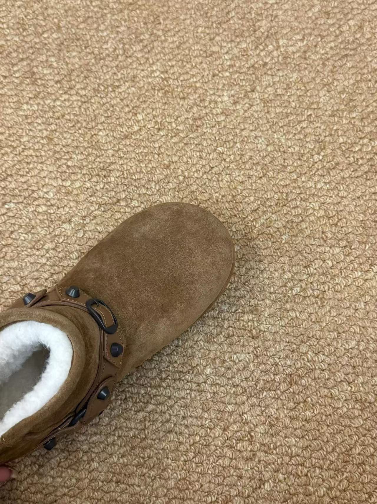 鏤空金屬鉚釘如騎士鎧甲般點綴周圍,瞬間打破雪地靴的慵懶刻板印象,注入搖滾機車的硬朗不羈,完美詮釋「甜酷」混搭風格。