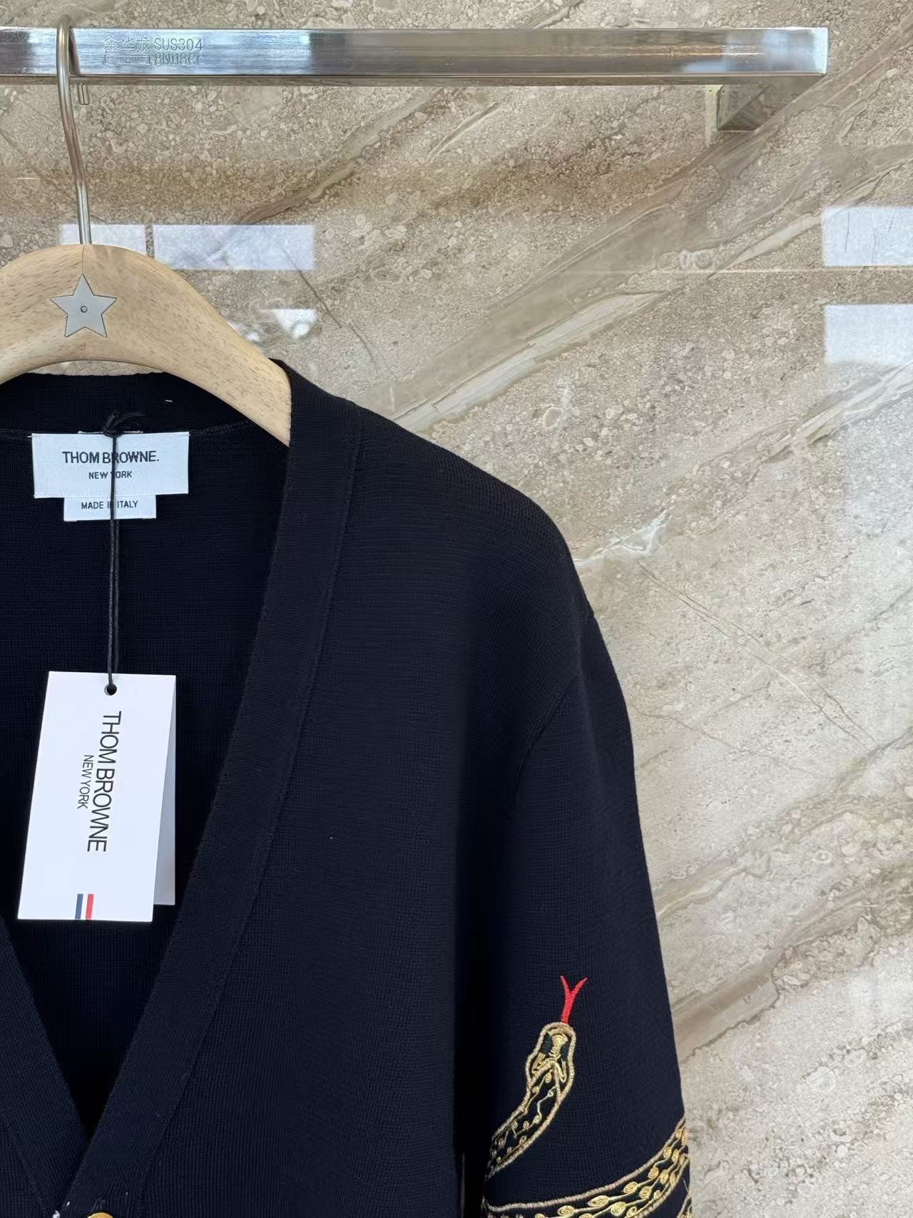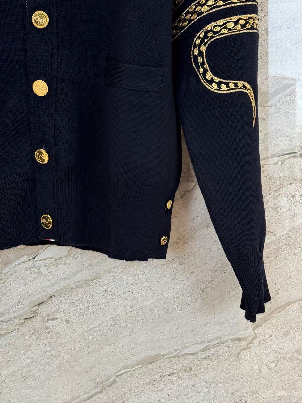 蛇年圖案:開衫巧妙地融入了蛇年的限定元素,將充滿設計感的蛇形圖案以精緻的刺繡或提花工藝呈現在羊毛衫上。這個設計不僅充滿了節日氛圍,也讓經典的 TB 開衫多了一份個性和收藏價值。