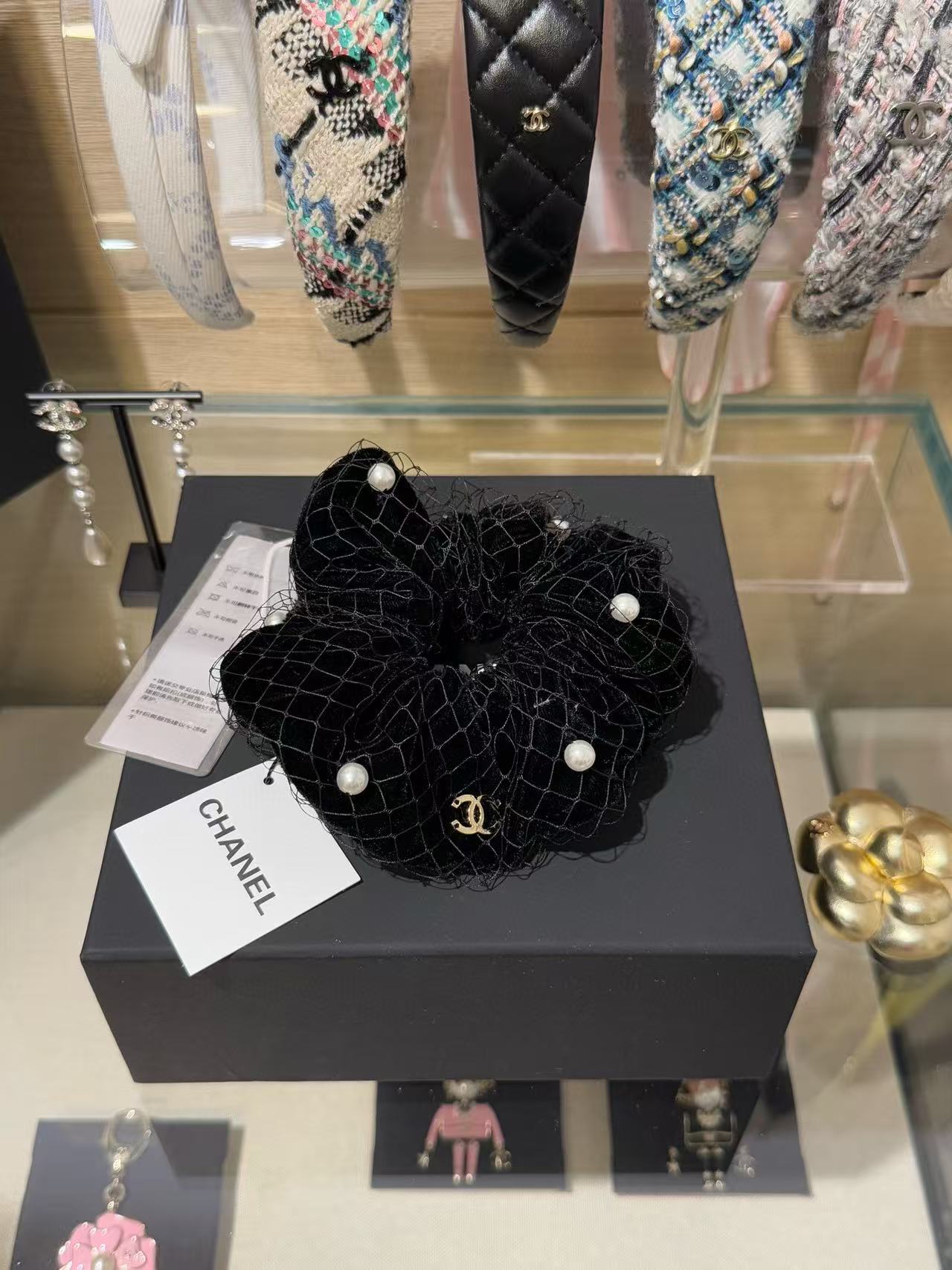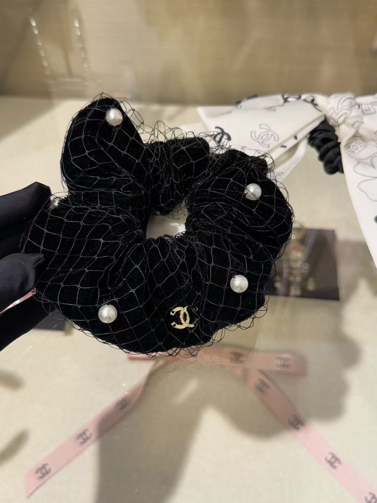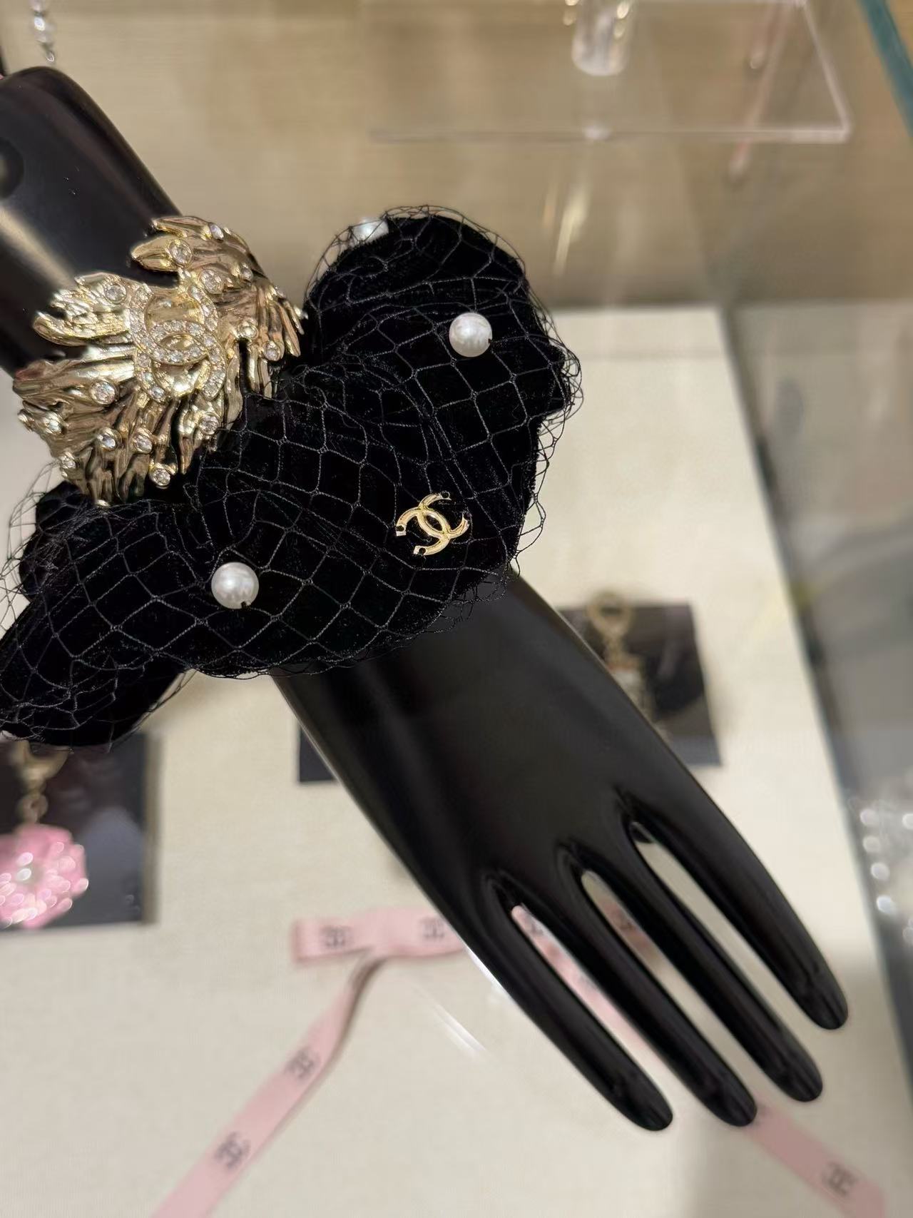 2025早秋 Chanel  黑絲絨網紗珍珠大髮圈 精品 高仿