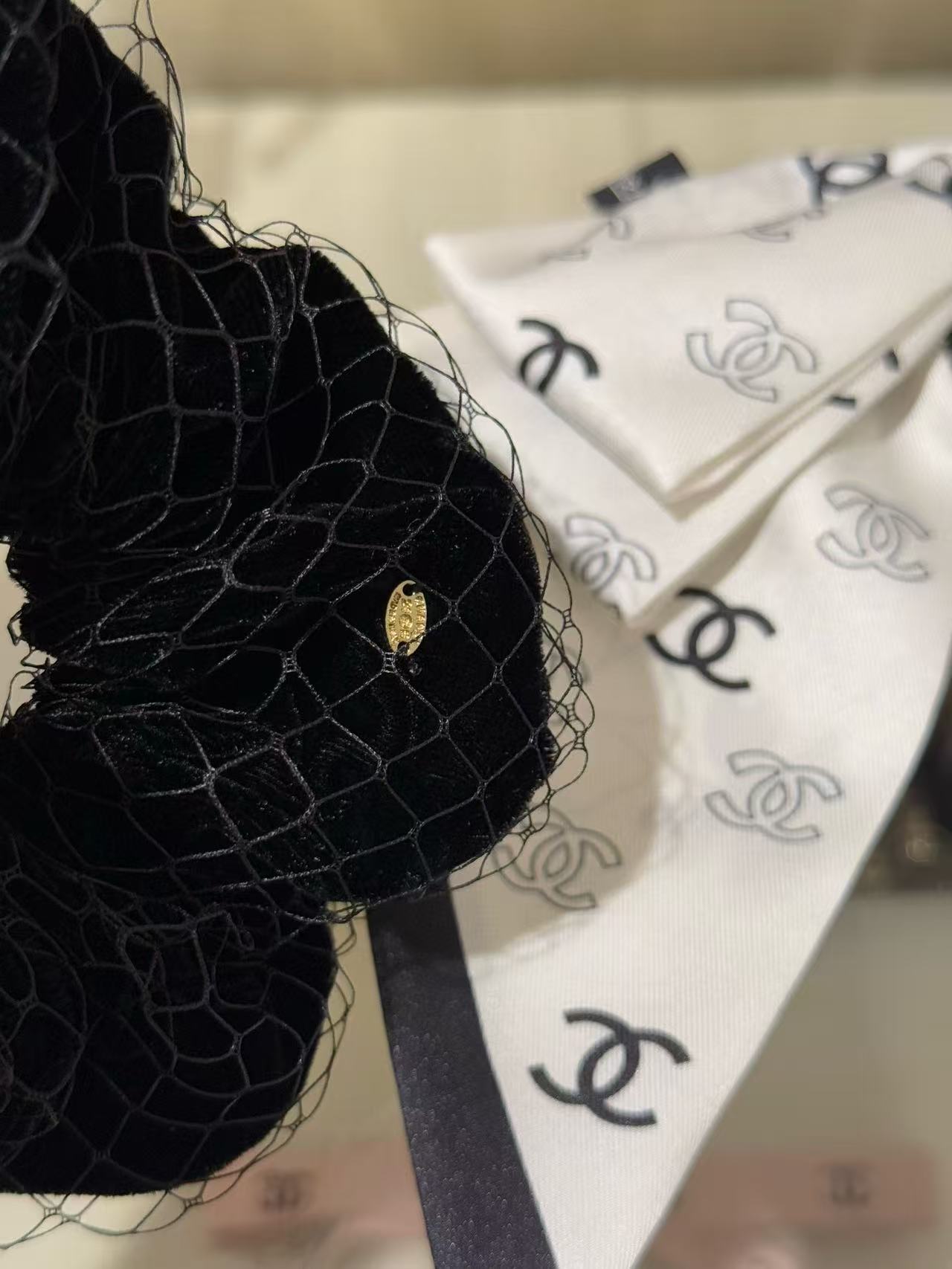 材質:黑絲絨與網紗結合,觸感柔軟細膩,輕盈耐用;小珍珠點綴增添光澤,淺金色雙C徽標精緻閃耀,這些都彰顯了復刻精品的精工工藝。
