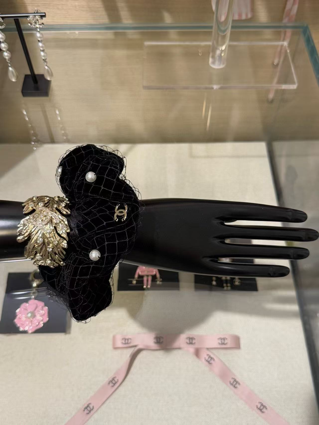 Chanel 黑絲絨網紗珍珠大髮圈 精品 高仿